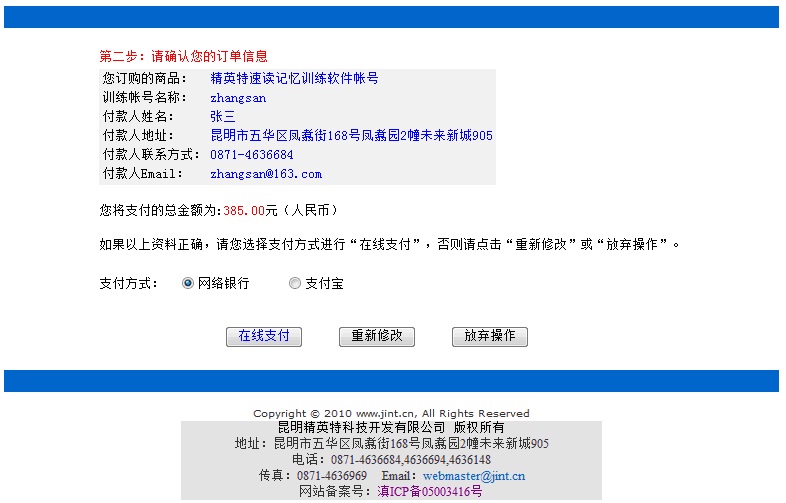 第二步:點(diǎn)擊“確認(rèn)訂單”進(jìn)入下面的頁(yè)面,請(qǐng)認(rèn)真確認(rèn)填寫的訂單信息,并選擇自己的支付方式,我們提供了“網(wǎng)絡(luò)銀行”和“支付寶”兩種支付方式,選擇后請(qǐng)點(diǎn)擊“在線支付”;