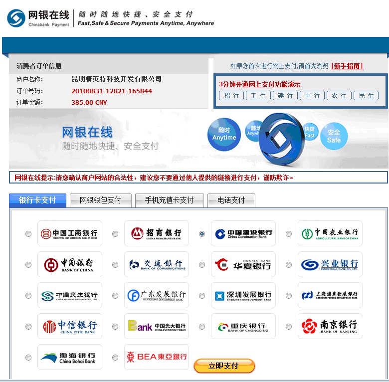 第三步:如果你選擇“網(wǎng)絡(luò)銀行”支付,則進(jìn)入下面的網(wǎng)頁(yè),請(qǐng)選擇自己的網(wǎng)絡(luò)支付銀行進(jìn)行支付;